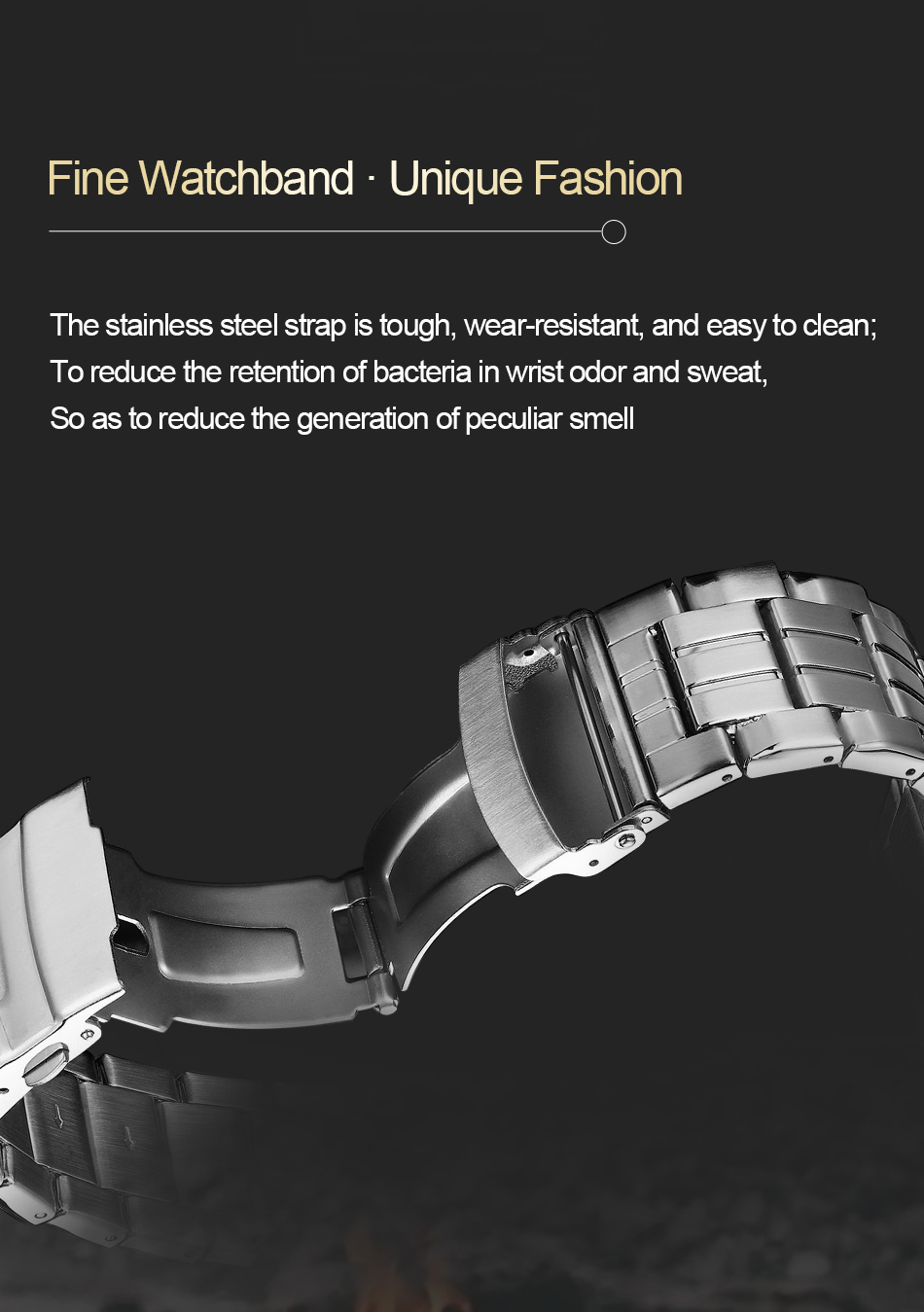 30-meter water resistance: withstand splashes or immersion in water, and cannot be used in hot baths and saunas. Note: Do not operate the watch buttons in the water;