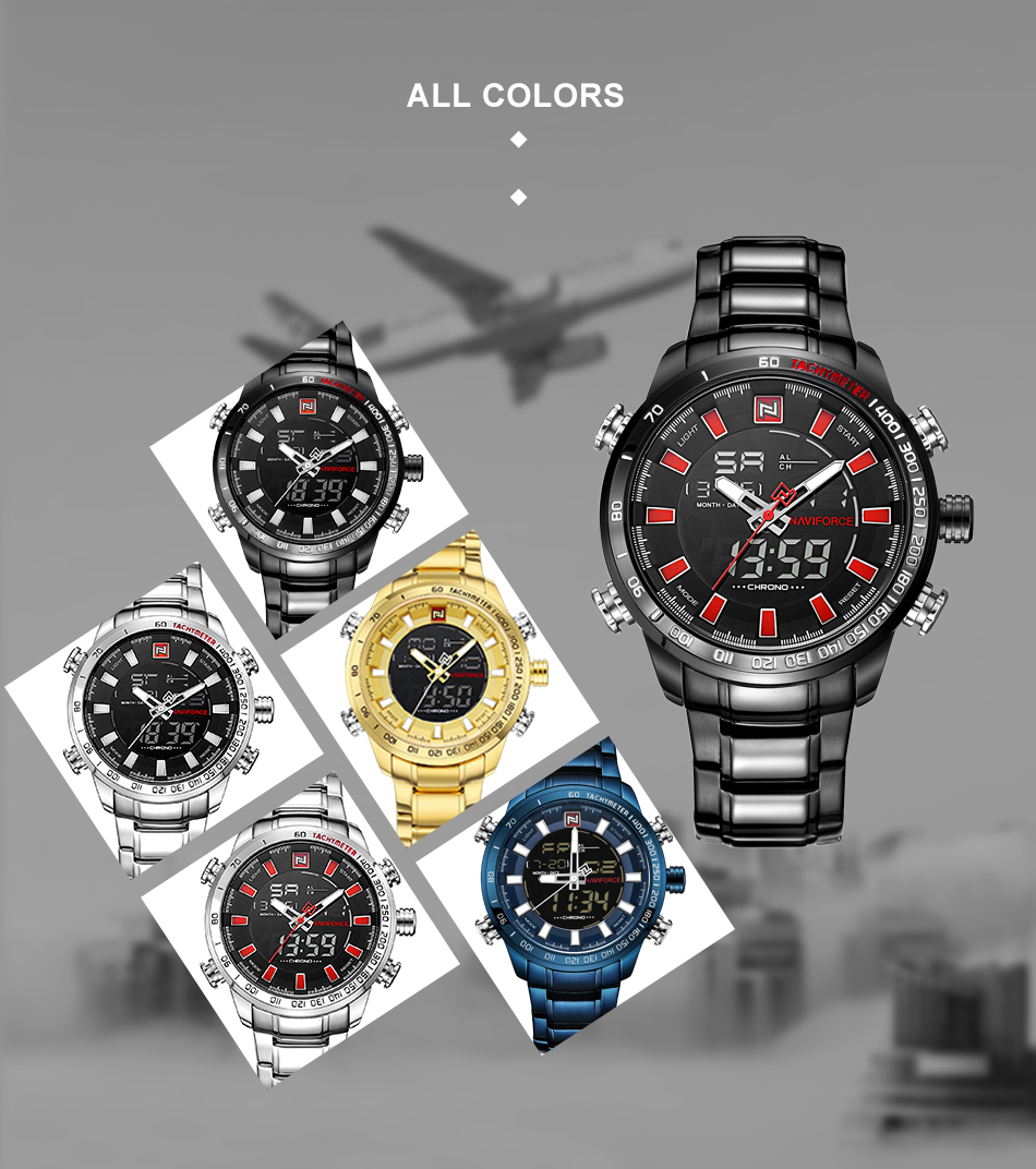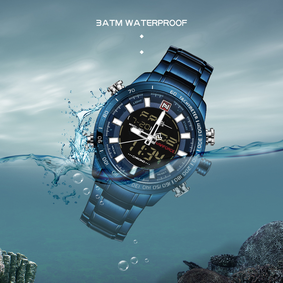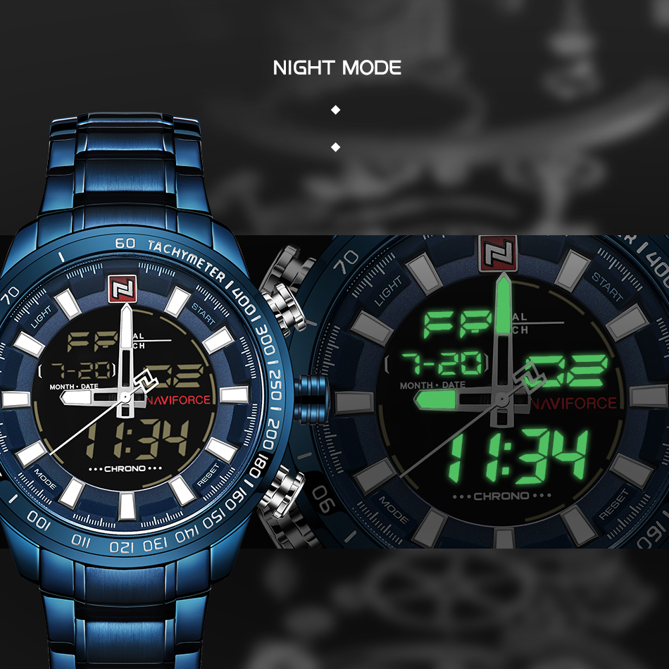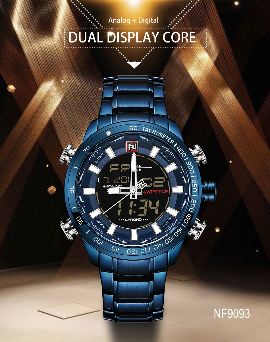 NAVIFORCE Top Brand Military Sport Watches Mens LED Analog Digital Alarm Stainless Steel Quartz WristWatch NF9093