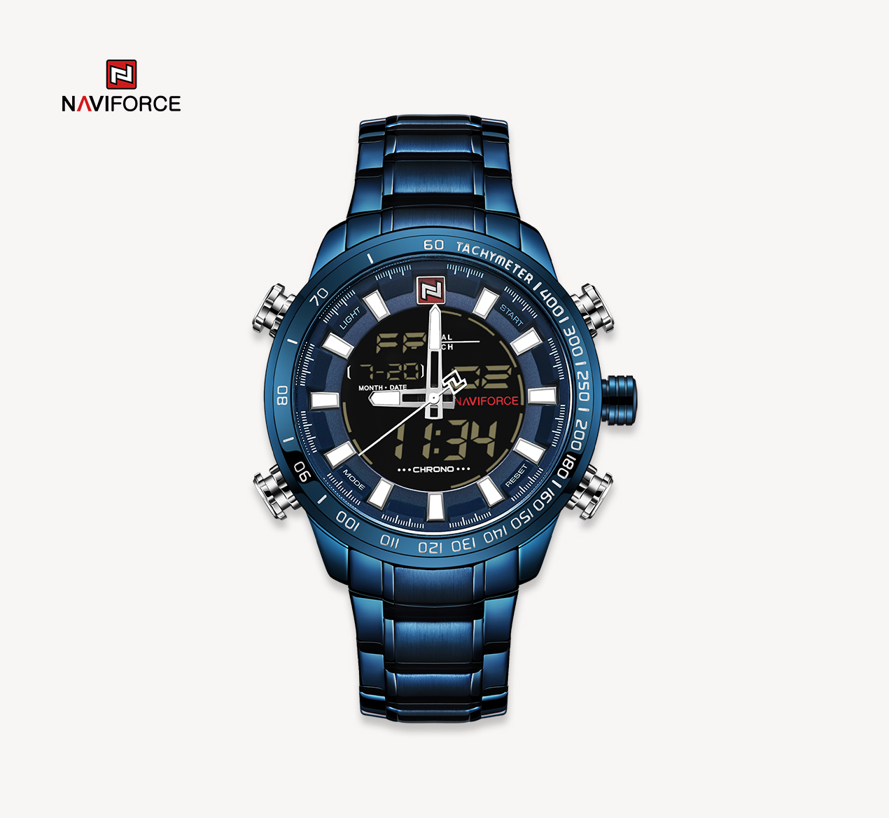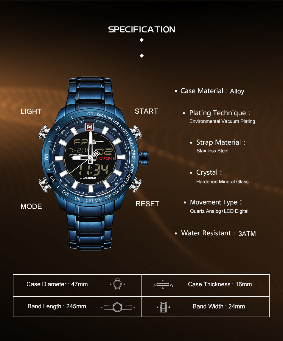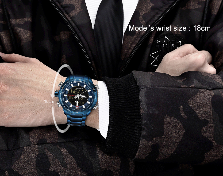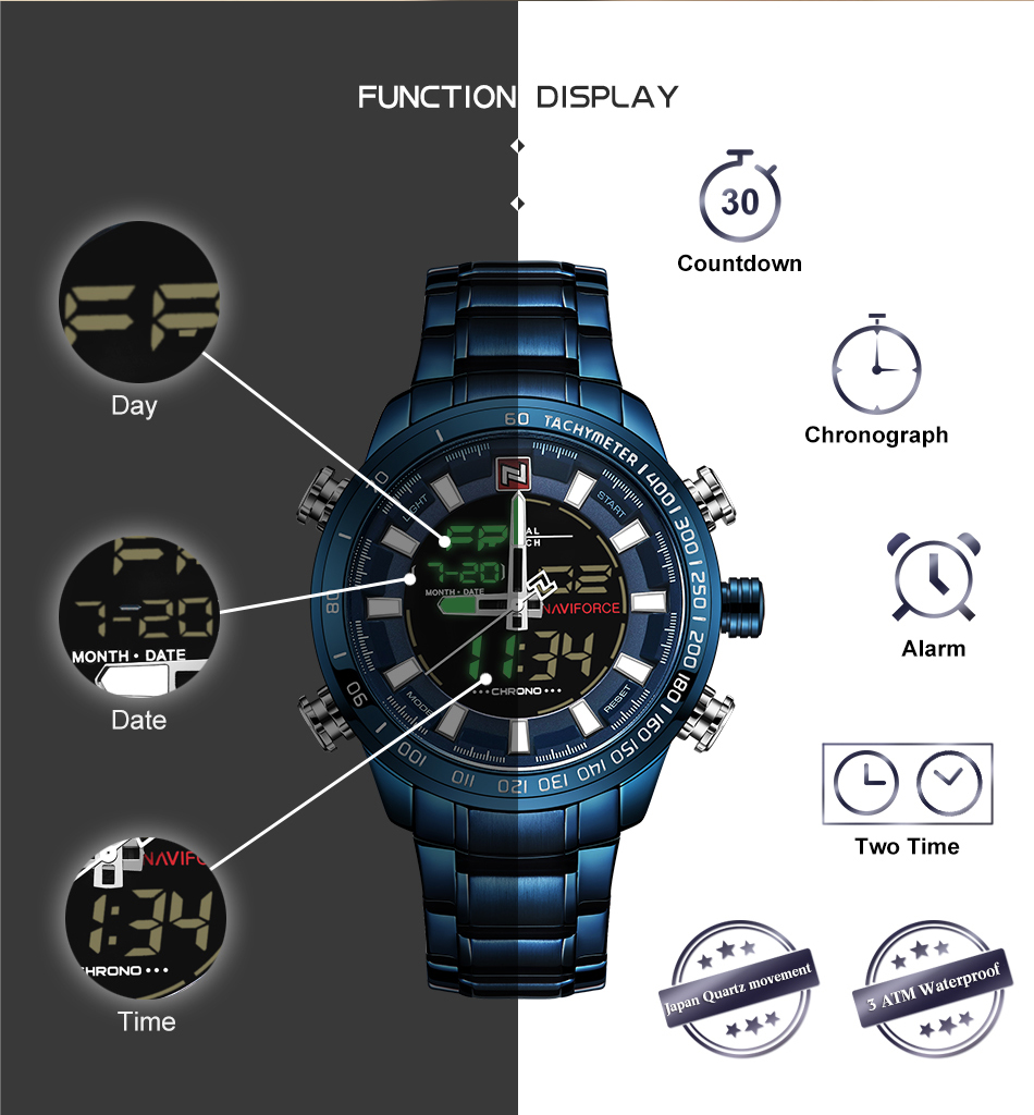 NAVIFORCE Top Brand Military Sport Watches Mens LED Analog Digital Alarm Stainless Steel Quartz WristWatch NF9093