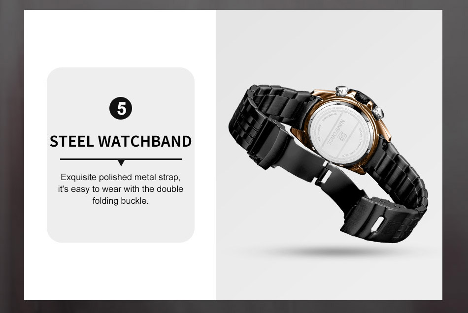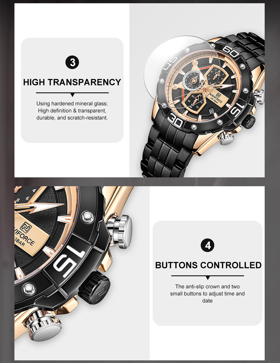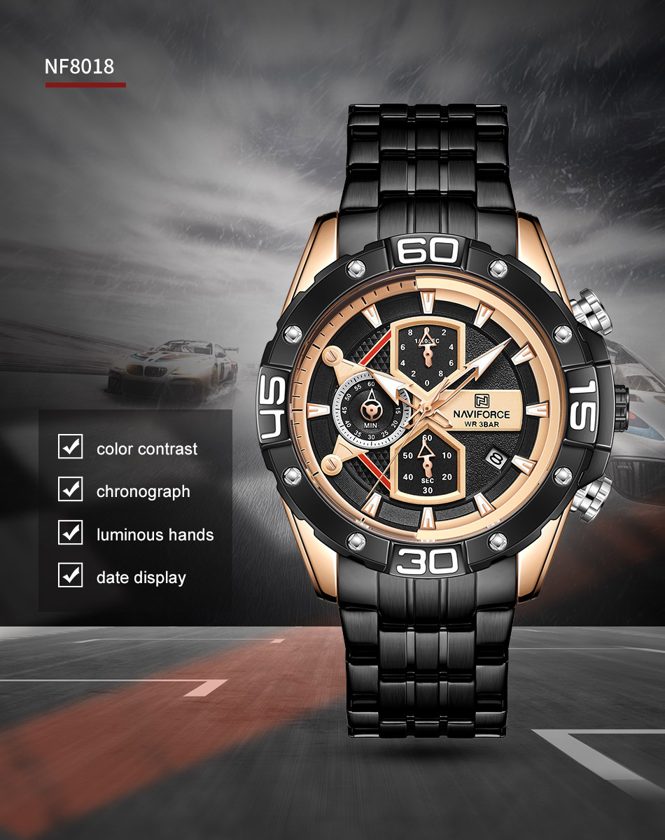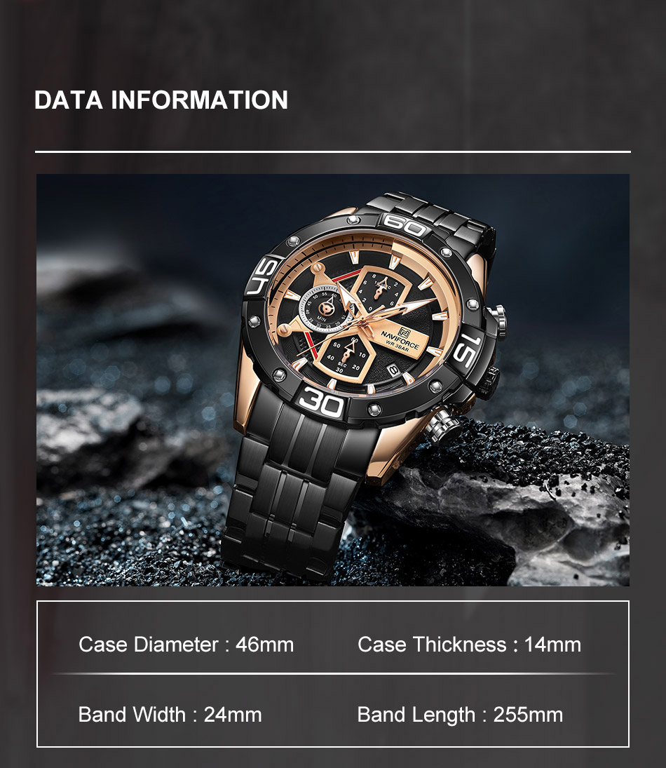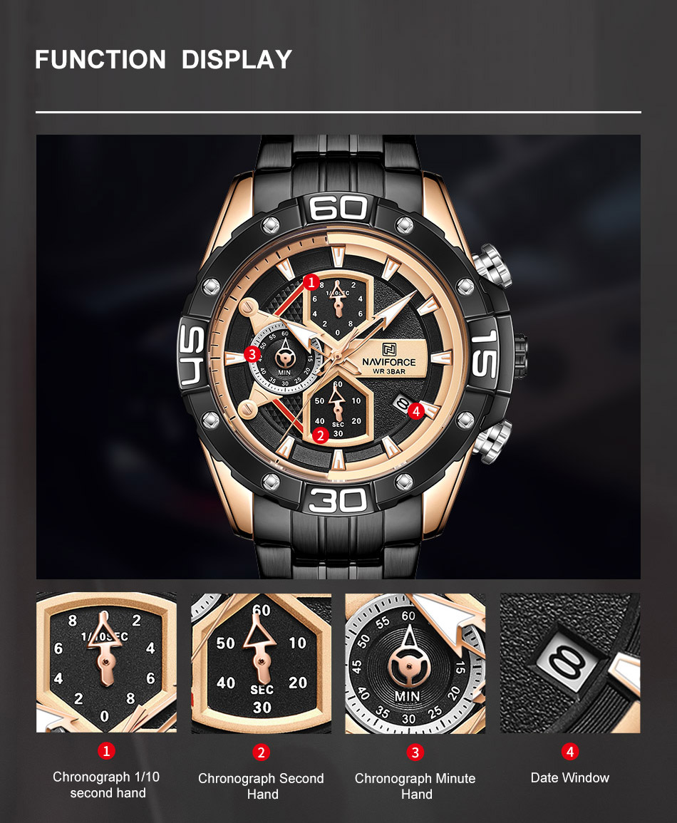 Multi-function sports watch:NAVIFORCE sports style watch, characteristic hourglass-shaped small window, three small dials covering 1/10 minutes and seconds, second hand, stopwatch, four o’clock calendar window, luminous hands and nails;