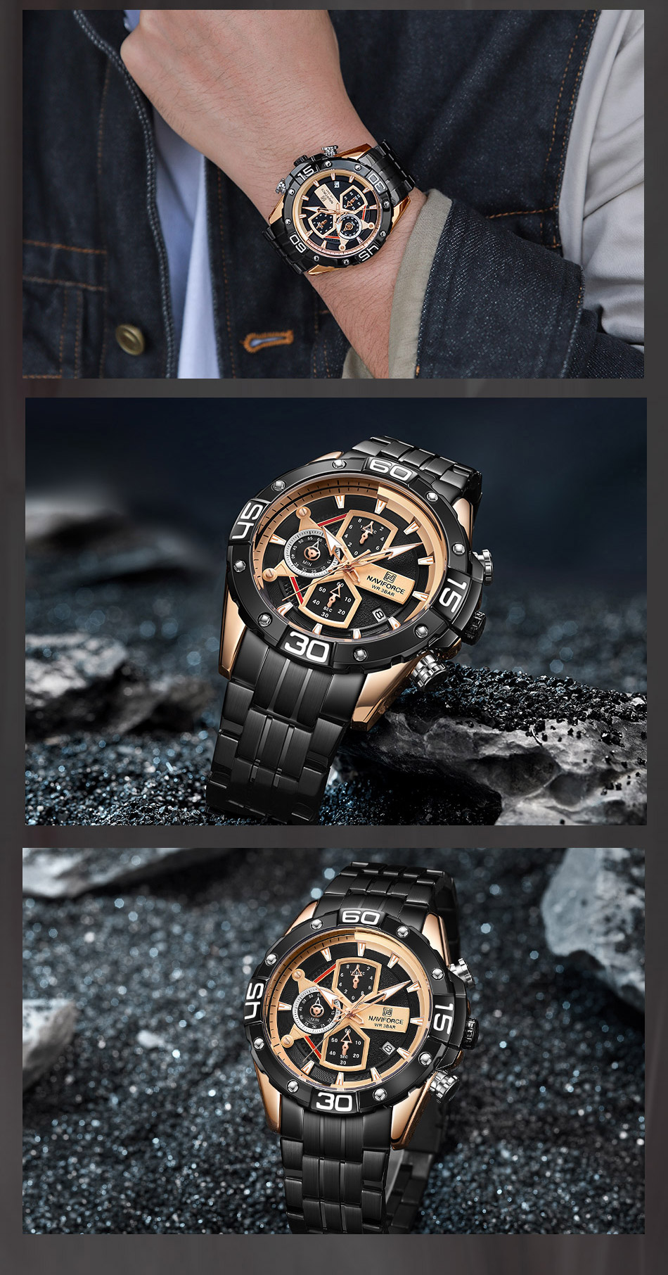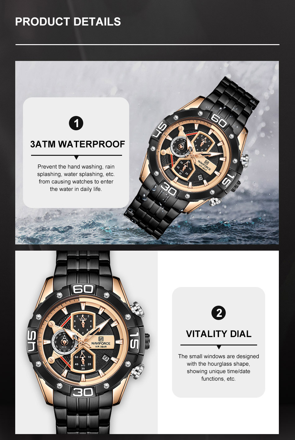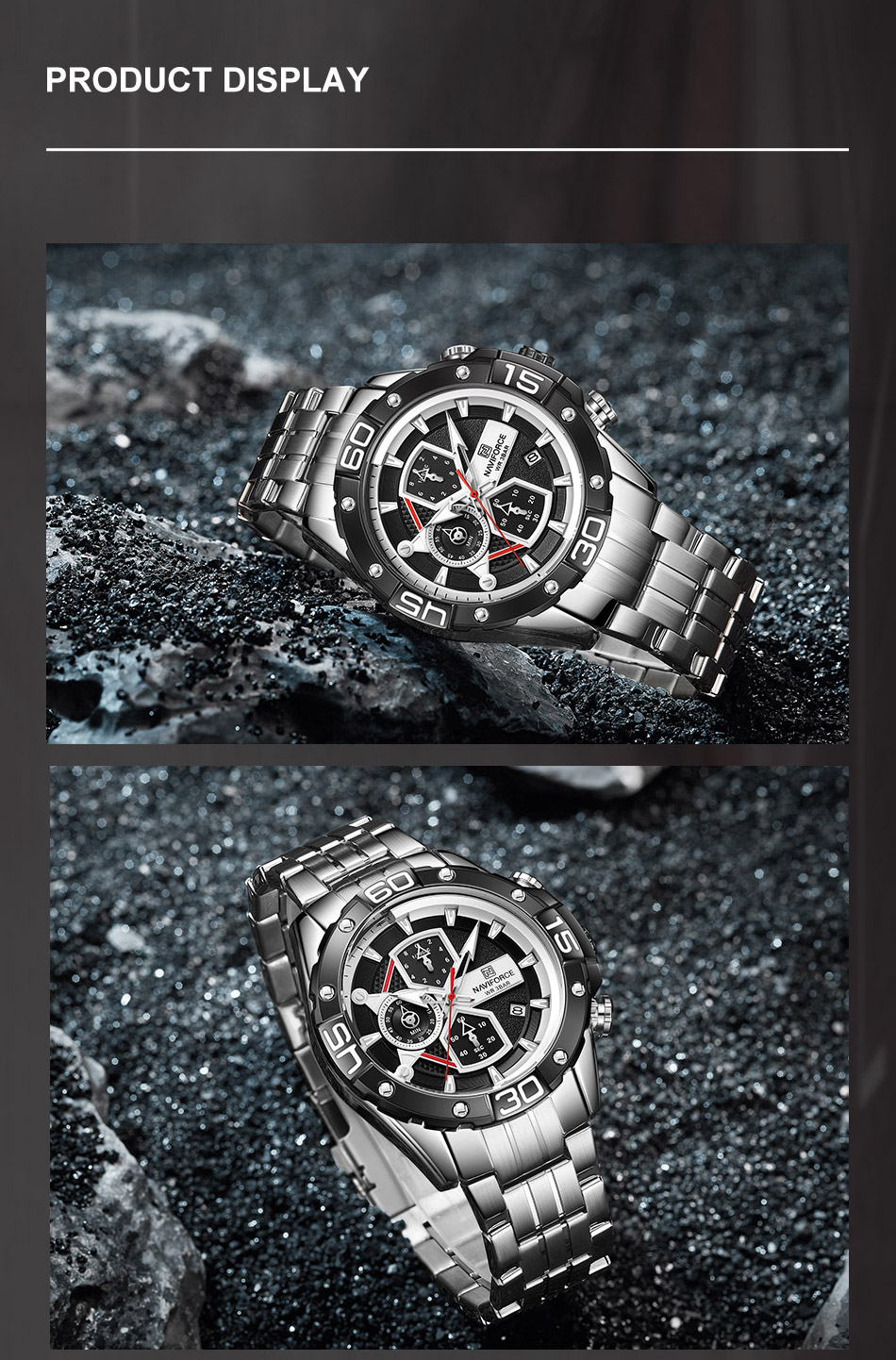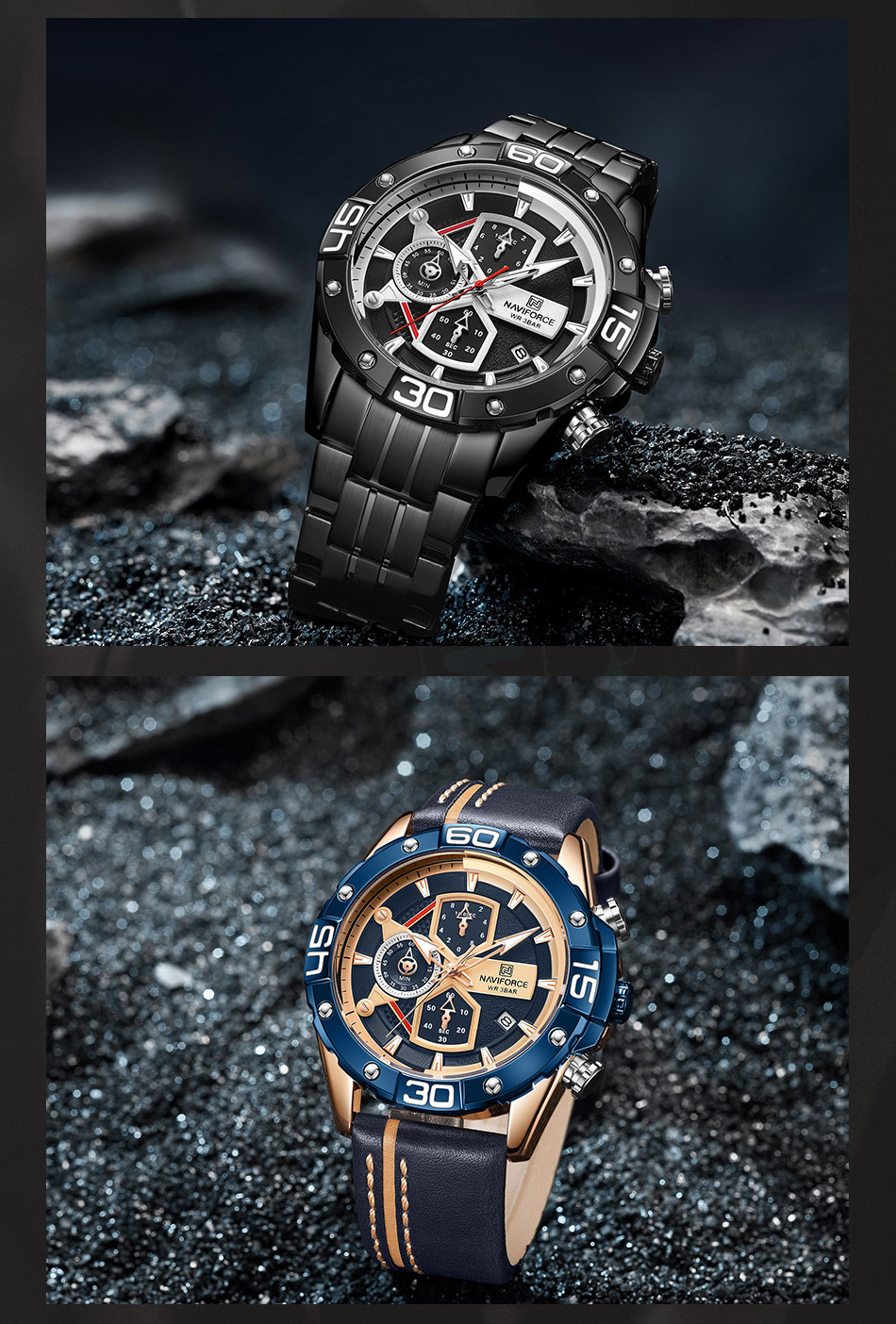 Multi-function sports watch:NAVIFORCE sports style watch, characteristic hourglass-shaped small window, three small dials covering 1/10 minutes and seconds, second hand, stopwatch, four o’clock calendar window, luminous hands and nails;