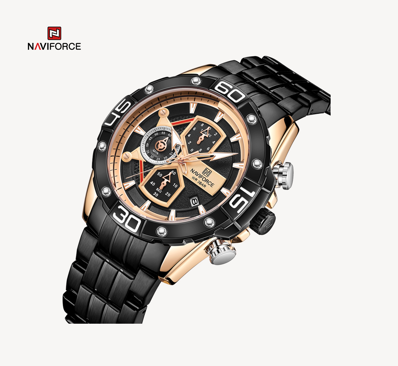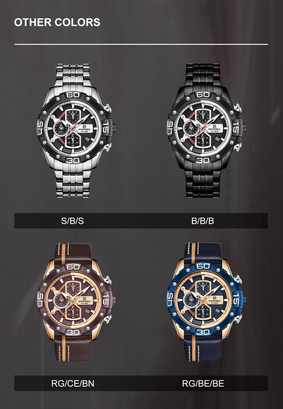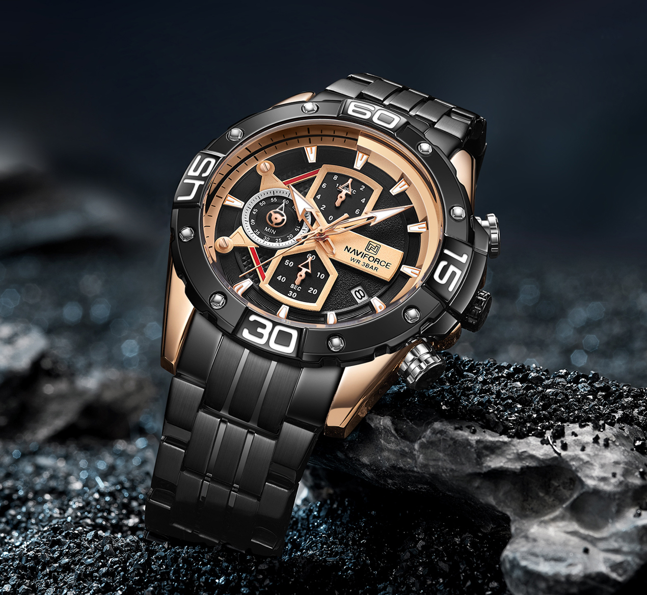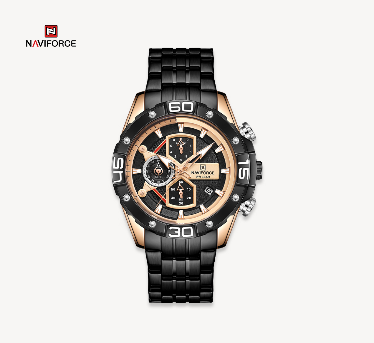 Multi-function sports watch:NAVIFORCE sports style watch, characteristic hourglass-shaped small window, three small dials covering 1/10 minutes and seconds, second hand, stopwatch, four o’clock calendar window, luminous hands and nails;