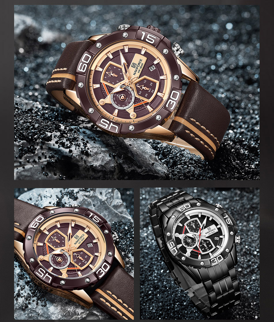 NAVIFORCE Sport Watches for Men Military Quartz Stainless Steel Chronograph Waterproof Leather Strap Wristwatch NF8018