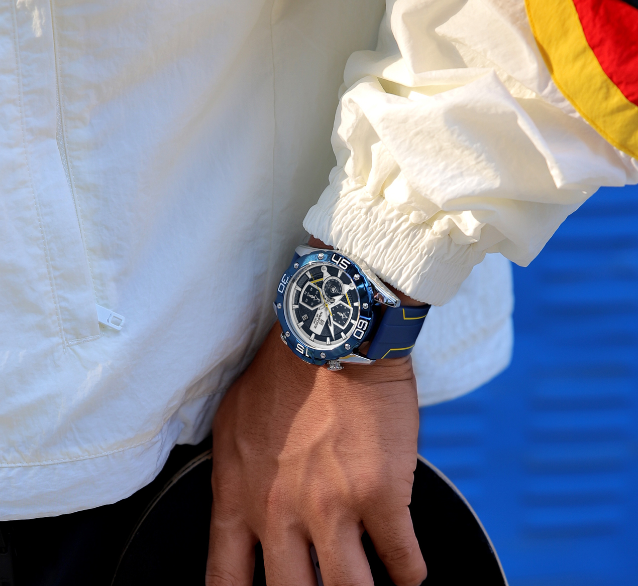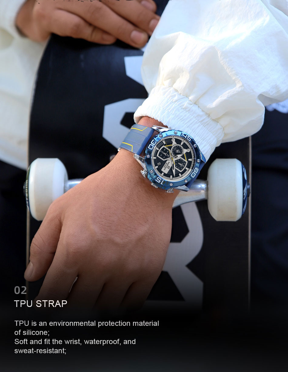 Multi-function:This men's sports watch has a clear date display and three small chronograph dials, which can count minutes, seconds, and 1/10 seconds. The backlight function makes you more visible in the dark, providing you with multi-functional purposes.