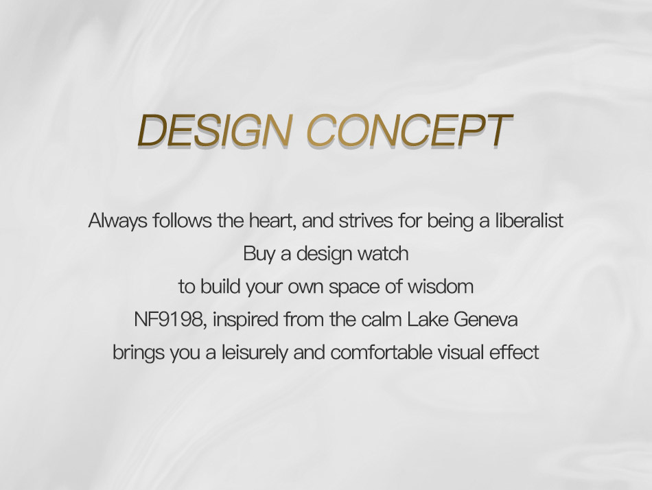 ★ Design Concept: Always follow heart, and strives for being a liberalist. Buy a design watch to build your own space of wisdom, NF9198, inspired from the calm lake Geneva, brings you a leisurely and comfortable visual effect.