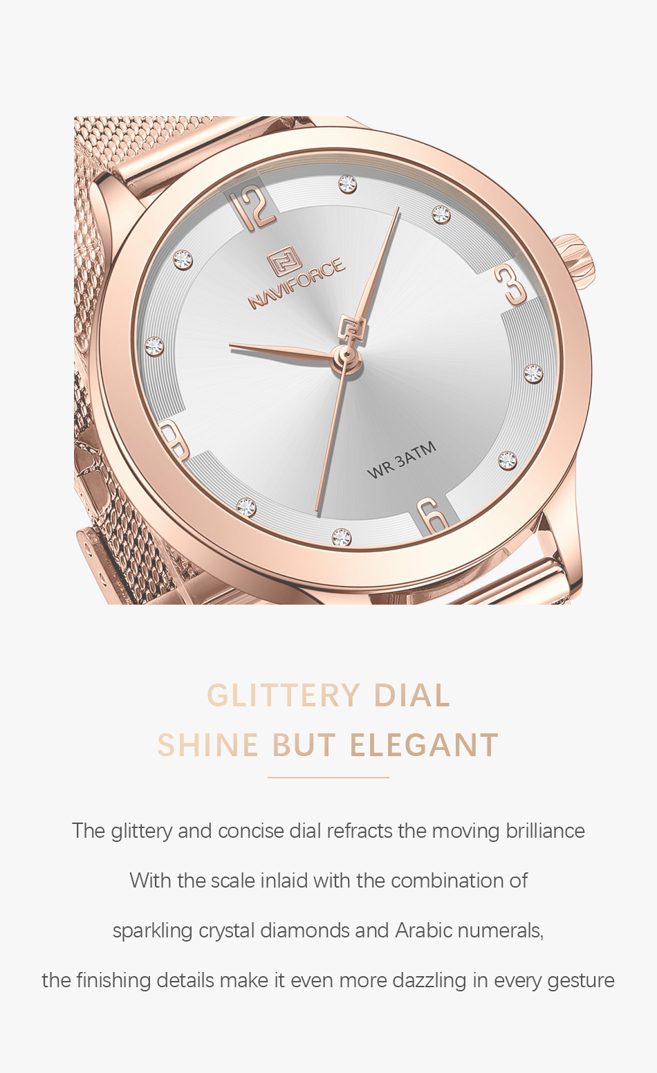 ◉DESIGN INSPIRATION:What is minimalist beauty?It is a painstaking simple design.It is a versatile and unique temperament.It is a timeless elegance after careful cultivation of time; ◉GLITTERY DIAL SHINE BUT ELEGANT:The glittery and concise dial refracts the moving brilliance. With the scale inlaid with the combination of sparkling crystal diamonds and Arabic numerals, the finishing details make it even more dazzling in every gesture; ◉SIMPLE CASE PURE BUT BUSINESSLIKE:Adopting environmental vaccum ionplating, the watch case is lustrous and smooth tactile. Concise and neat appearance design shows generous and frank femininity; ◉MESH BRACELET GENTLE BUT POWERFUL:The Milanese woven mesh bracelet made of stainless steel presents a fashionable beauty that combines rigidity and softness. Matched with a convenient hanging buckle, you can always feel free and easy; ◉3ATM WATERPROOF:Prevent the hand washing, rain splashing, etc. from causing watches to enter the water in daily life; ◉HARDENED MINERAL GLASS:High transparency, durable, and scratch-resistant; ◉ANTI-SKIDDING CROWN:Novel chic crown makes it more easily to adjust time.