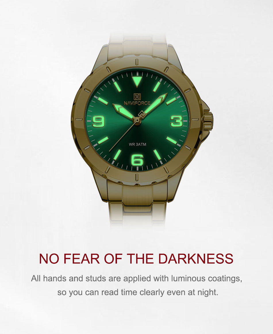 ◉DESIGN INSPIRATION:What is a sassy look?It is the sophistication that extends from your outfit.The personalized tension released by delicate rounded dial and the neat bezel with edges makes your unconstraint more visible;CONFIDENCE +100%, GLAMOUR RATING +∞ ◉DYNAMICAL BEZEL--FULL OF WHIMSY ATMOSPHERE:Following the iconic design of NAVIFORCE, this timepiece creates a distinct personality with neat lines, showing a more capable posture and interpreting the unrestrained charm of confident women; ◉GLITTERY DIAL--REFINE A SASSY TRUESELF:Light reflections on the sunray-motif dial let your aura generate from the inside. With numeral studs at 3, 6 and 9 o'clock position, you can get a novel feeling of the colliding of hardness and softness; ◉TEXTURED STRAP--PRESENT WELL-BALANCED TENSION:The sturdy and gorgeous metal strap fits the wrist to set off the lines of the hand. Equipped with a convenient double folding clasp with safety, showing elegance in every gesture; ◉NO FEAR OF THE DARKNESS:All hands and studs are applied with luminous coatings, so you can read time clearly even at night; ◉3ATM WATERPROOF:Prevent the hand washing, rain splashing, etc. from causing watches to enter the water in daily life; ◉HARDENED MINERAL GLASS:High transparency, durable, and scratch-resistant; ◉ANTI-SKIDDING CROWN:Delicate gear shaped crown makes it more easily to adjust time.