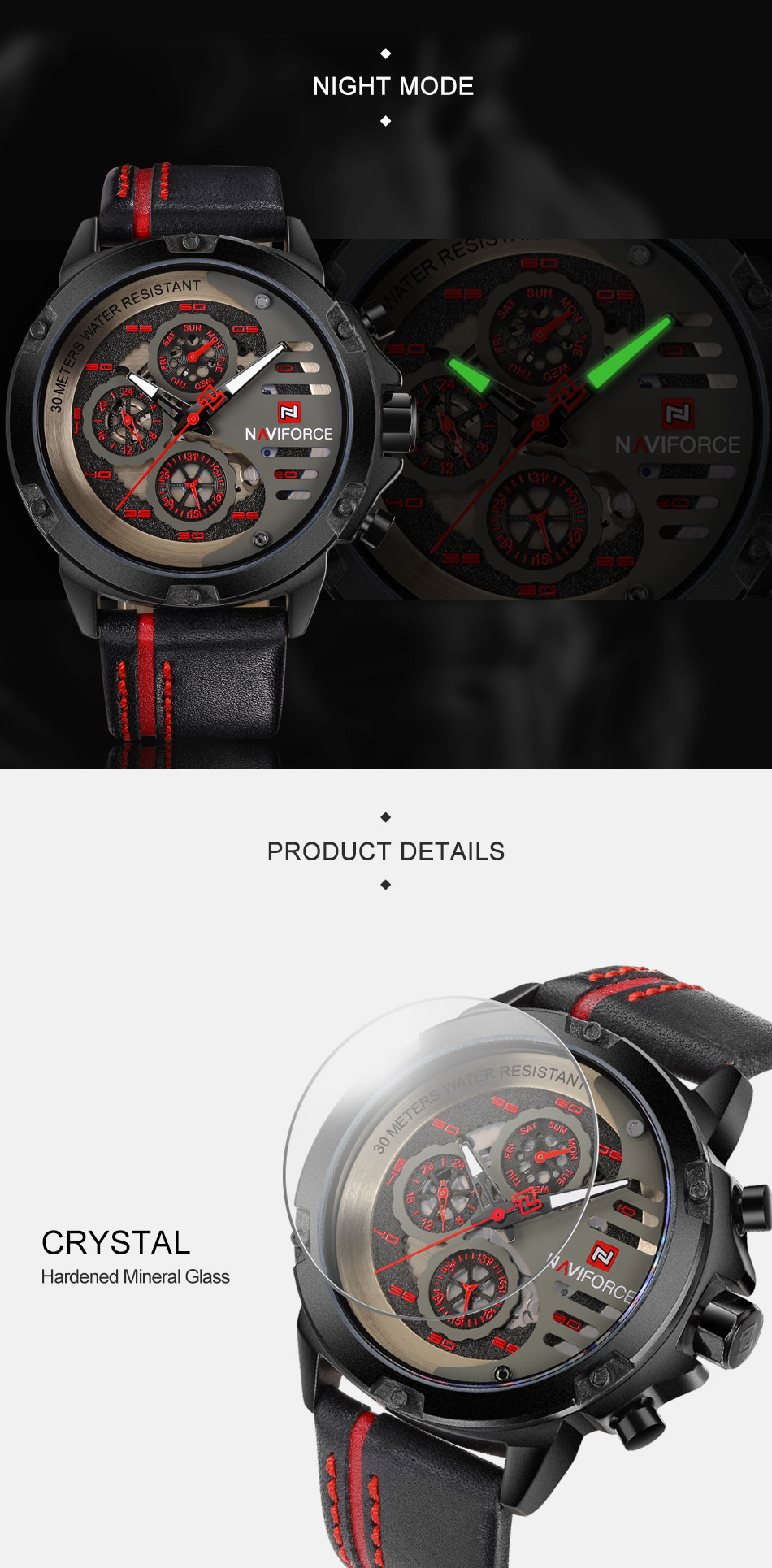 NAVIFORCE military waterproof watch, the perfect combination of sports and leisure, stylish big face appearance and multi-function, perfect match with jeans, T-shirts or suits;