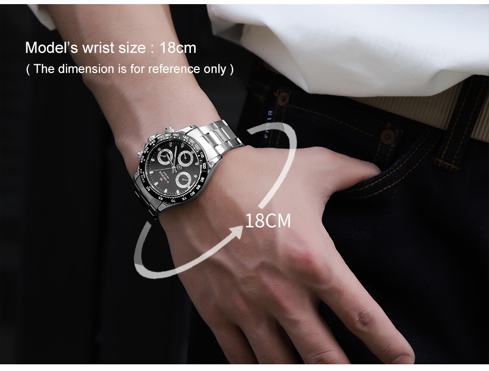 Fashion business watch: unisex watch, 38.5mm case, 13mm thickness, 230mm watch length (strap length can be adjusted), lug width 20mm, watch weight 122g;